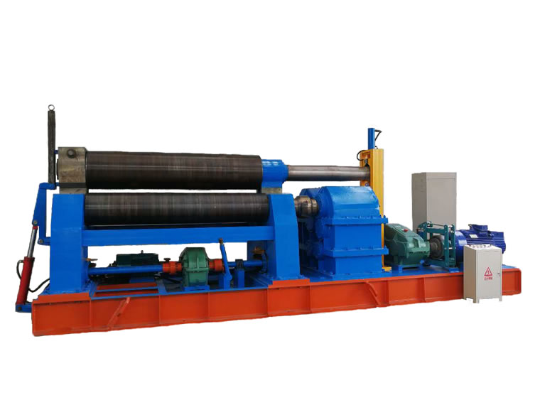 本機(jī)為對稱式三輥卷板機(jī),兩下輥為主動(dòng)固定輥,上輥通過升降絲桿、渦輪、蝸桿在兩下輥對稱中央作上下移動(dòng),兩下輥的正、反旋轉(zhuǎn)和上輥的升降移動(dòng)均靠電機(jī)帶動(dòng)減速器來完成,并能借助手動(dòng)離合器把上輥調(diào)節(jié)成平行或傾斜位置,以適應(yīng)卷制圓形和錐形工件的需要;并設(shè)有液壓倒頭翻轉(zhuǎn)和液壓壓緊上桿裝置,由電器控制,取代了一般人工倒頭和人工壓緊上桿的操作方法;渦輪上下配有特種壓力軸承,轉(zhuǎn)動(dòng)輕松、省電耐磨。該機(jī)設(shè)計(jì)先進(jìn)、自動(dòng)化程度高,全電控操作,使用方便、省時(shí)、省力。